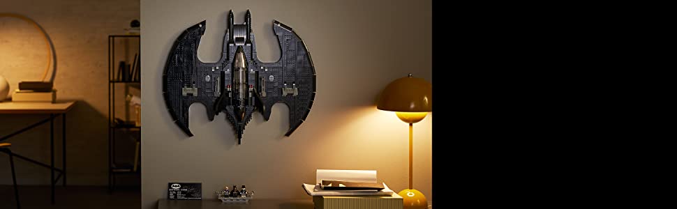 • Measuring over 4” (11cm) high, 20” (52cm) long and 22” (58cm) wide, the LEGO DC BATMAN 1989 Batwing looks stunning on its stand and when attached to the wall
