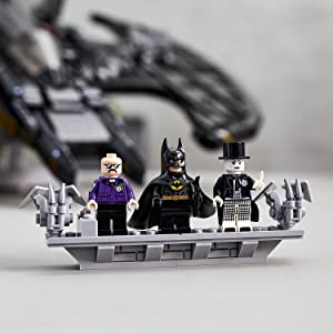 • The iconic style of the Batwing from the 1989 BATMAN movie is enhanced by a sturdy stand, nameplate and 3 minifigures: BATMAN, THE JOKER and a Boombox goon